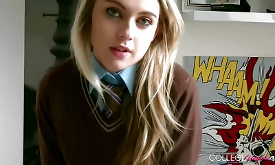 Chloe Toy Rubs On Bed Until She Finishes Off With Her Uniform On!