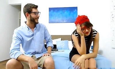 Step-sister in pigtails and fur asks for spunk in her mouth