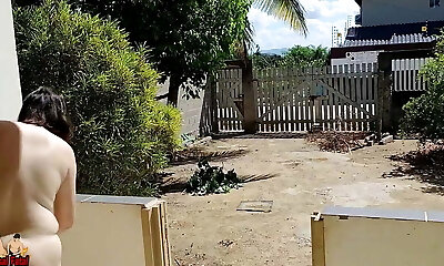 обнаженная домохозяйка убирает балкон